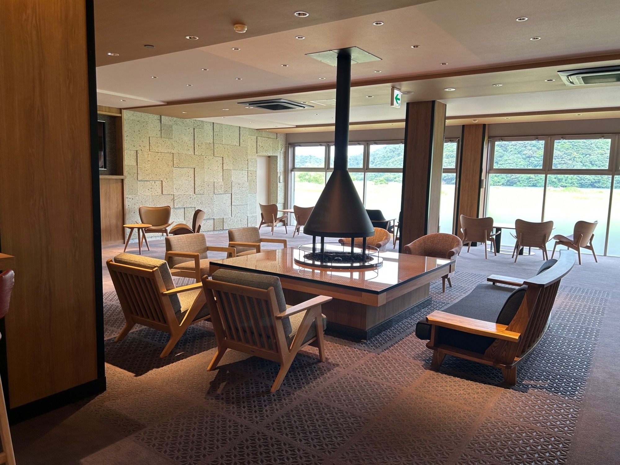 また、ラウンジには卓上に暖炉を置いた大型テーブルを設置。 天然木の美しい木目を楽しんでいただけるよう化粧練付け合板を使用して大工が施工した、世界に一つのテーブルです。